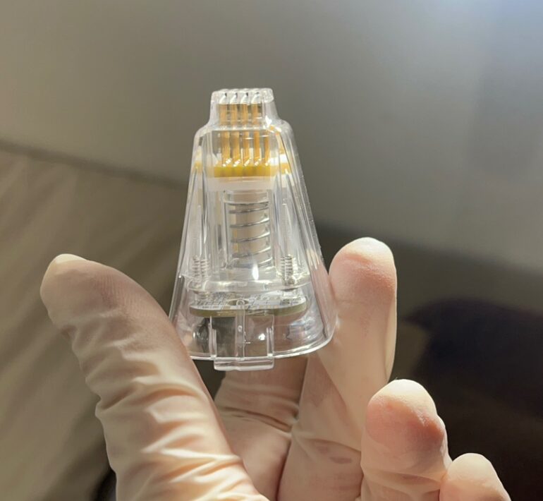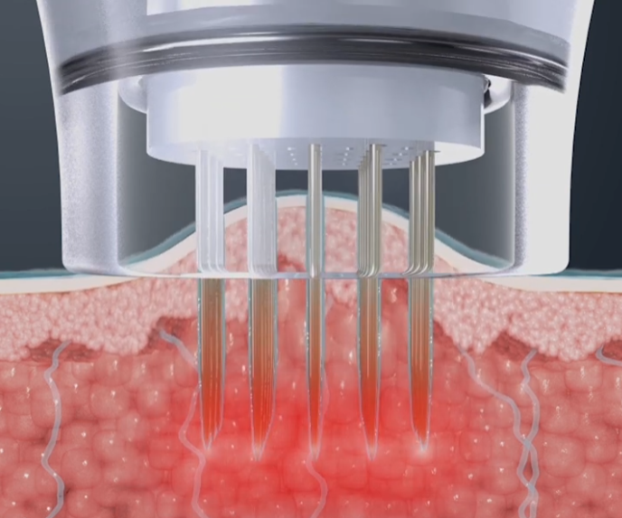 사진에 보이는 미세한 바늘을 피부에 찔러 넣고 고주파 에너지를 전달하는 방식이죠.